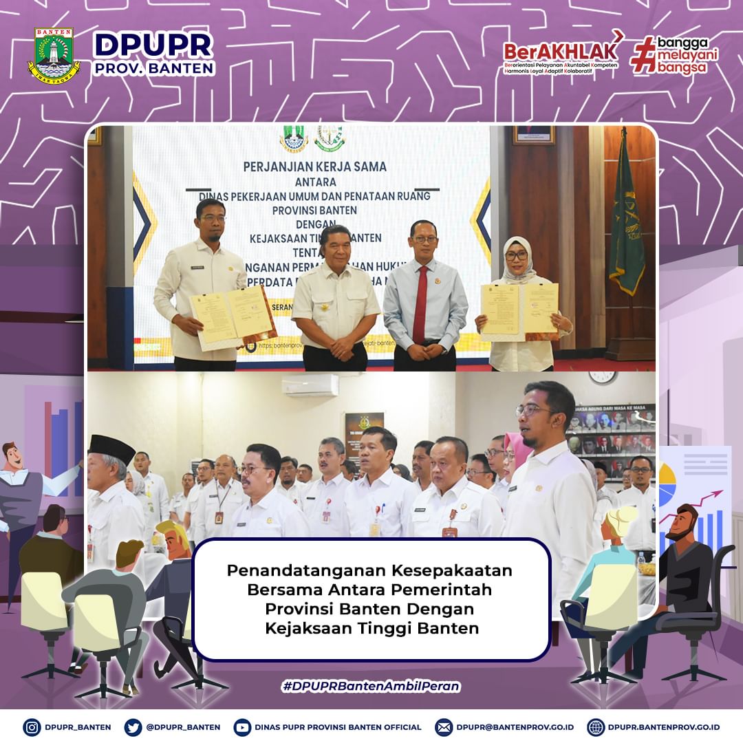 Sumber Gambar :dpupr_banten - Kepala Dinas PUPR Provinsi Banten Arlan Marzan bersama Pj. Gubernur Banten Al Muktabar dan Kepala Kejaksaan Tinggi Banten Dr. Siswanto, SH., MH menandatangani Kesepakatan Bersama antara Pemerintah Provinsi Banten dengan Kejaksaan Tinggi Banten Tentang Penanganan Permasalahan Hukum Bidang Perdata dan Tata Usaha Negara.